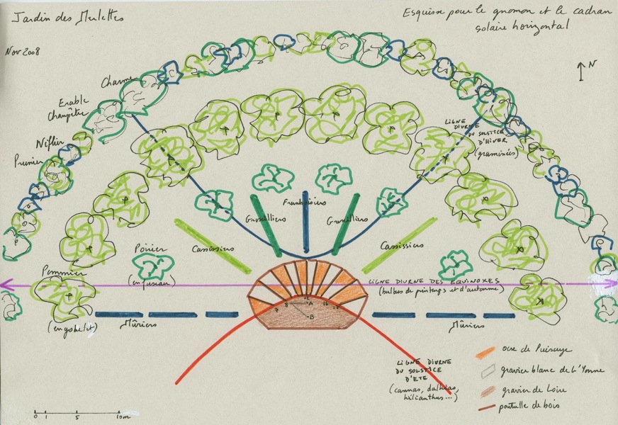 Le centre du verger est planté selon les lignes d’un immense cadran solaire pour permettre aux visiteurs de visualiser l’importance des saisons sur la longueur des ombres projetées dans un jardin. Les rayons du centre du cadran se prolongent par les plates-bandes plantées de petits fruits. Leur longueur reproduit celle des ombres portées par le soleil. Celles-ci sont très différentes selon les heures de la journée, les plus courtes autour de midi et les plus longues le matin et le soir. De plus, elles varient entre les deux solstices, celui d’hiver (quand les ombres sont les plus longues) et celui d’été (aux ombres les plus courtes), en fonction de l’azimut du soleil. Ainsi, les plates-bandes mesurent 3 m au centre du cadran et s’allongent progressivement à 3,5m puis 5,6m et enfin 17m. Les ombres correspondant aux deux solstices sont matérialisées par des repères au sol.