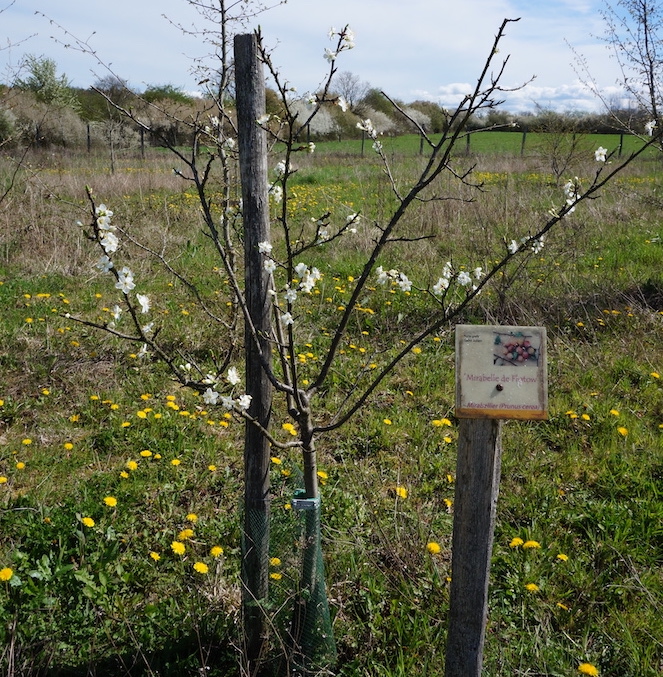 Le conservatoire compte neuf variétés de pruniers. Ci dessous, la ‘Mirabelle de Flotow’ est la seule avec la ‘Mirabelle de Metz’ et, hors du conservatoire, la ‘Saint Léonard’ qui a déjà produit des fruits. Nous voyons de plus en plus de fleurs chaque année, preuve que les organes fruitiers se développent bien, une petite consolation quand même. Nous avons déjà remarqué, dans une autre partie du jardin, que le prunier ‘Reine Claude Dorée’ avait produit des fruits assez médiocres plusieurs années de suite avant les belles prunes vertes moirées d’or qu’il nous a offertes cette année. Patience donc là encore, même si nous avons hâte de goûter toutes ces variétés aux noms prometteurs : ‘Abbaye d’Argon’, ‘Prune Abricot’, ‘Madeleine’, etc.