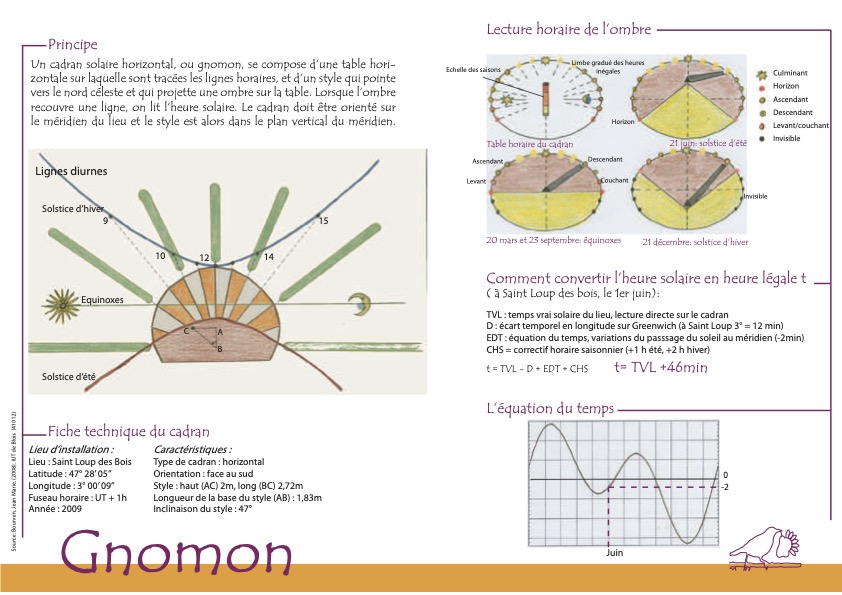 Quelques grands panneaux ont également été installés, dont celui-ci ( ci-dessous) qui détaille les particularités du gnomon et explique son fonctionnement pour que chacun puisse tester l’exactitude de cette horloge solaire perpétuelle.